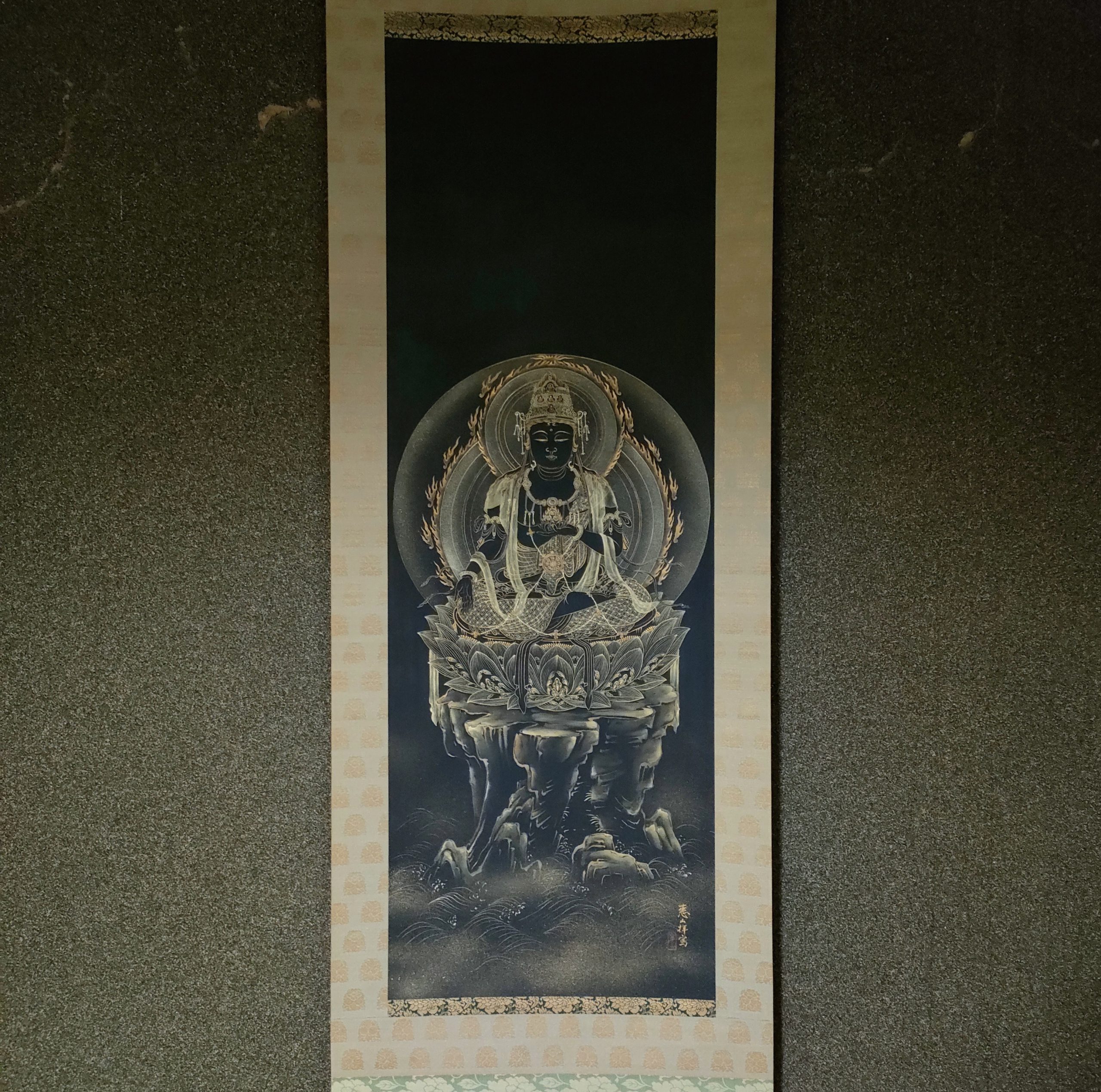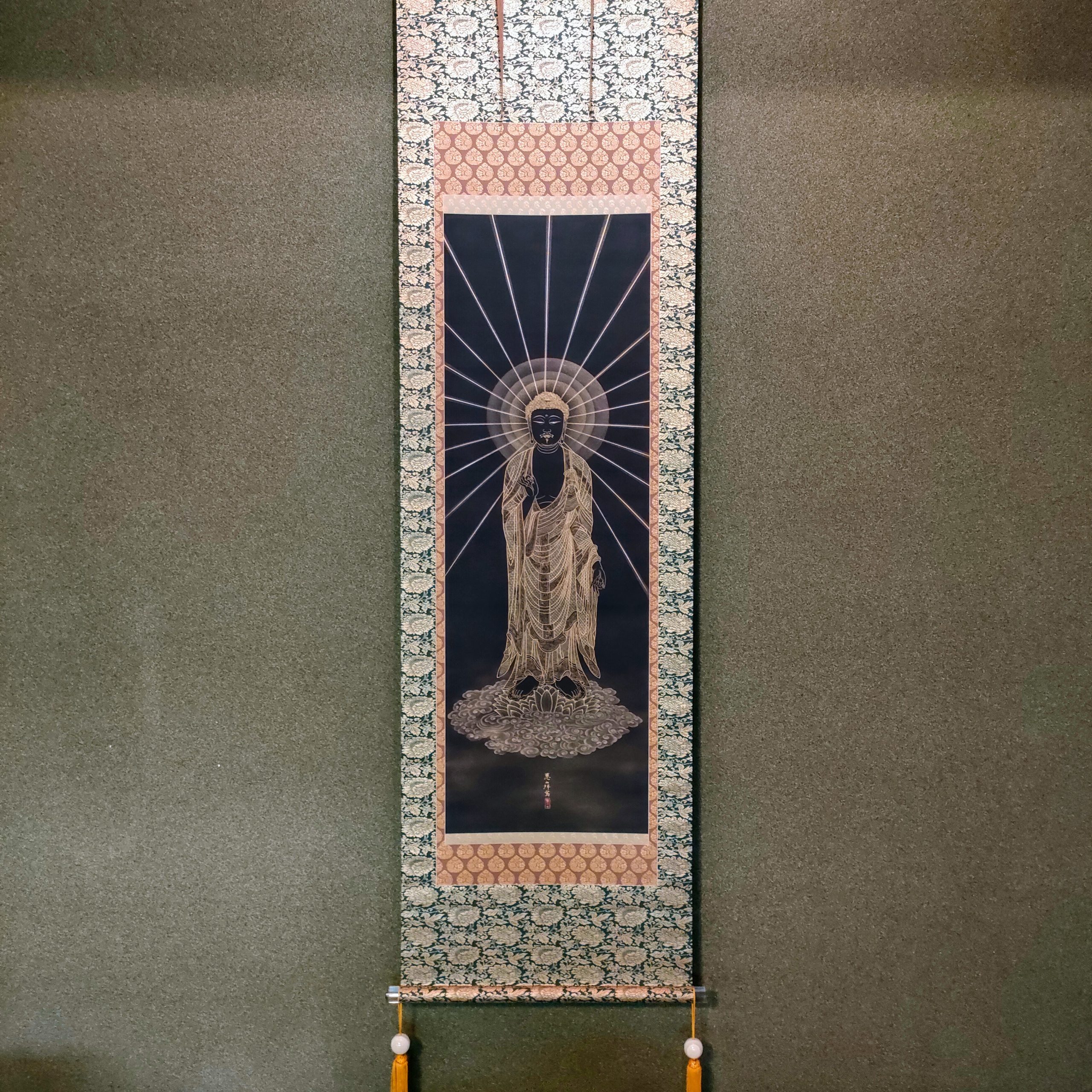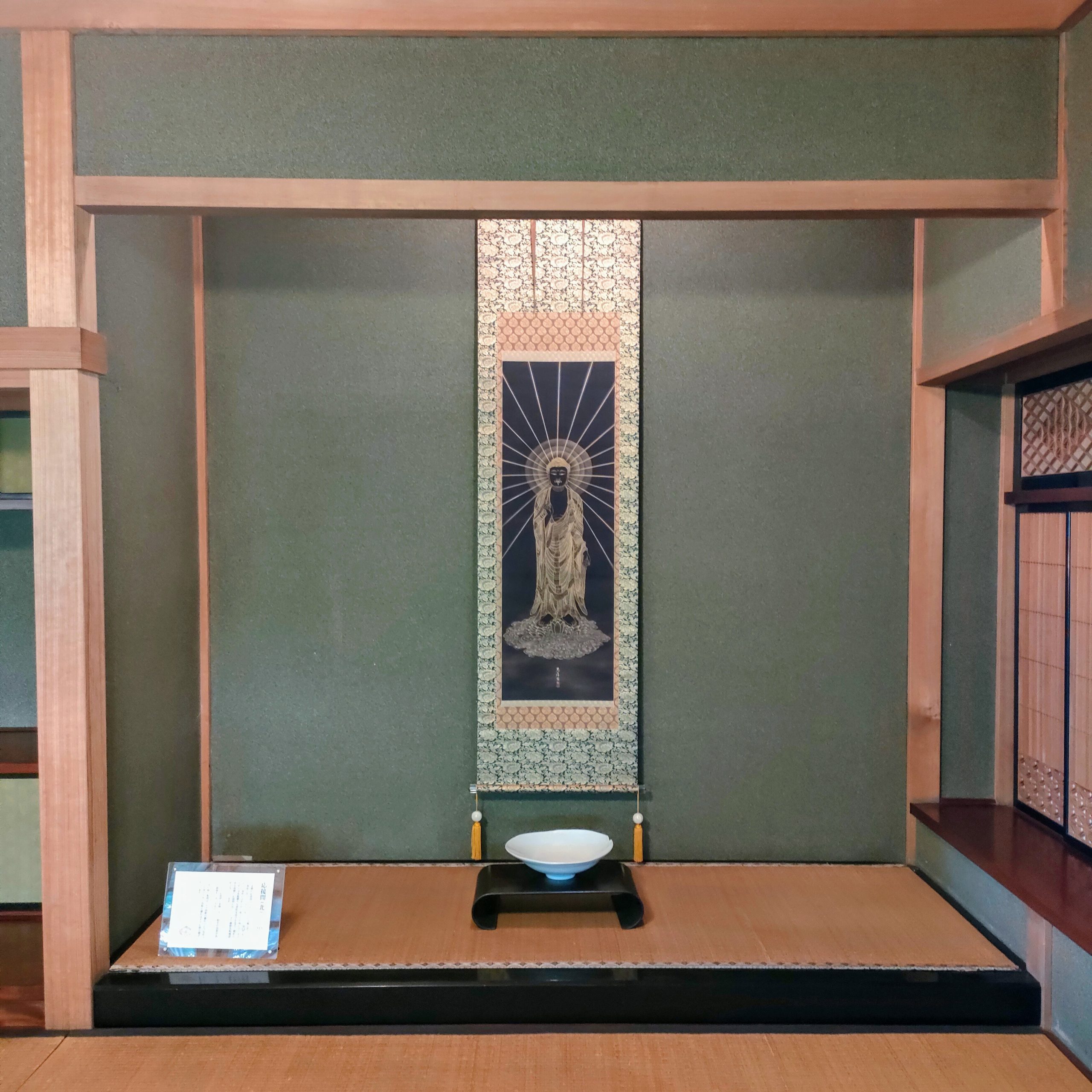 そして、別館二階応接間の掛け軸は写真三・四枚目の「阿弥陀如来尊像図(恵山作)」に掛け替えてみました。