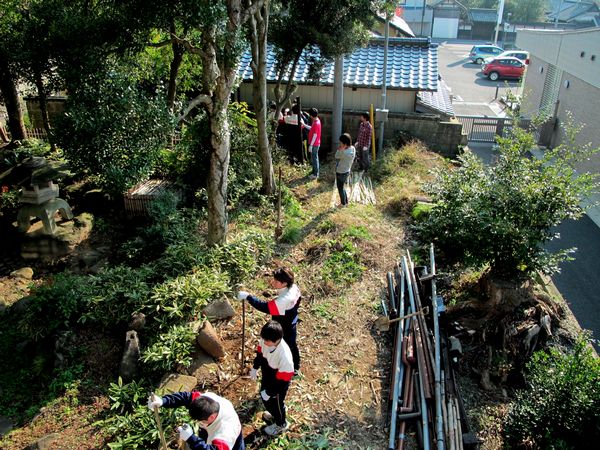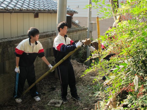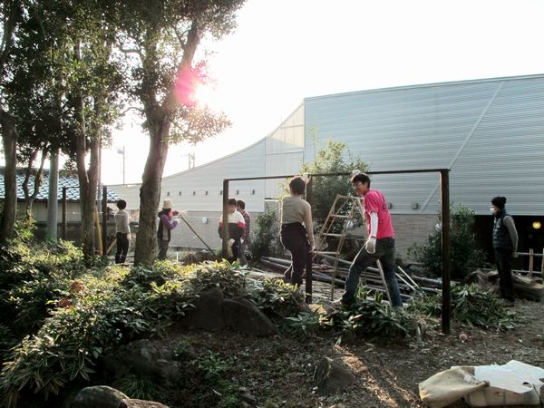 11月の満喫デーは、東造園の親方のご指導の下、エントランスの東側に竹垣を作ろうでした。