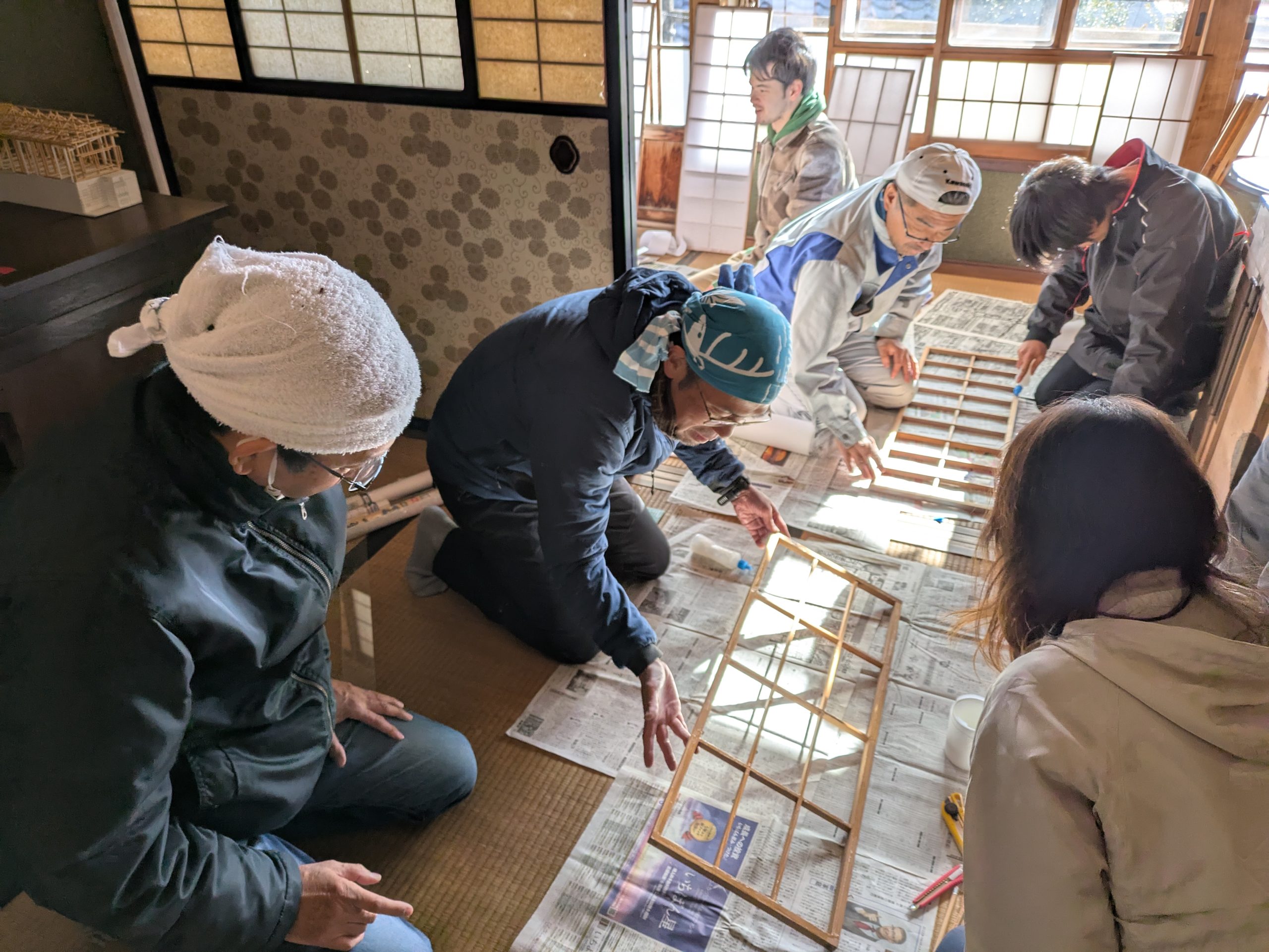古い障子紙を剥がして建具を洗い、新しい障子紙を貼っていきます。建具周りの掃除もして、明るい窓辺になりました。