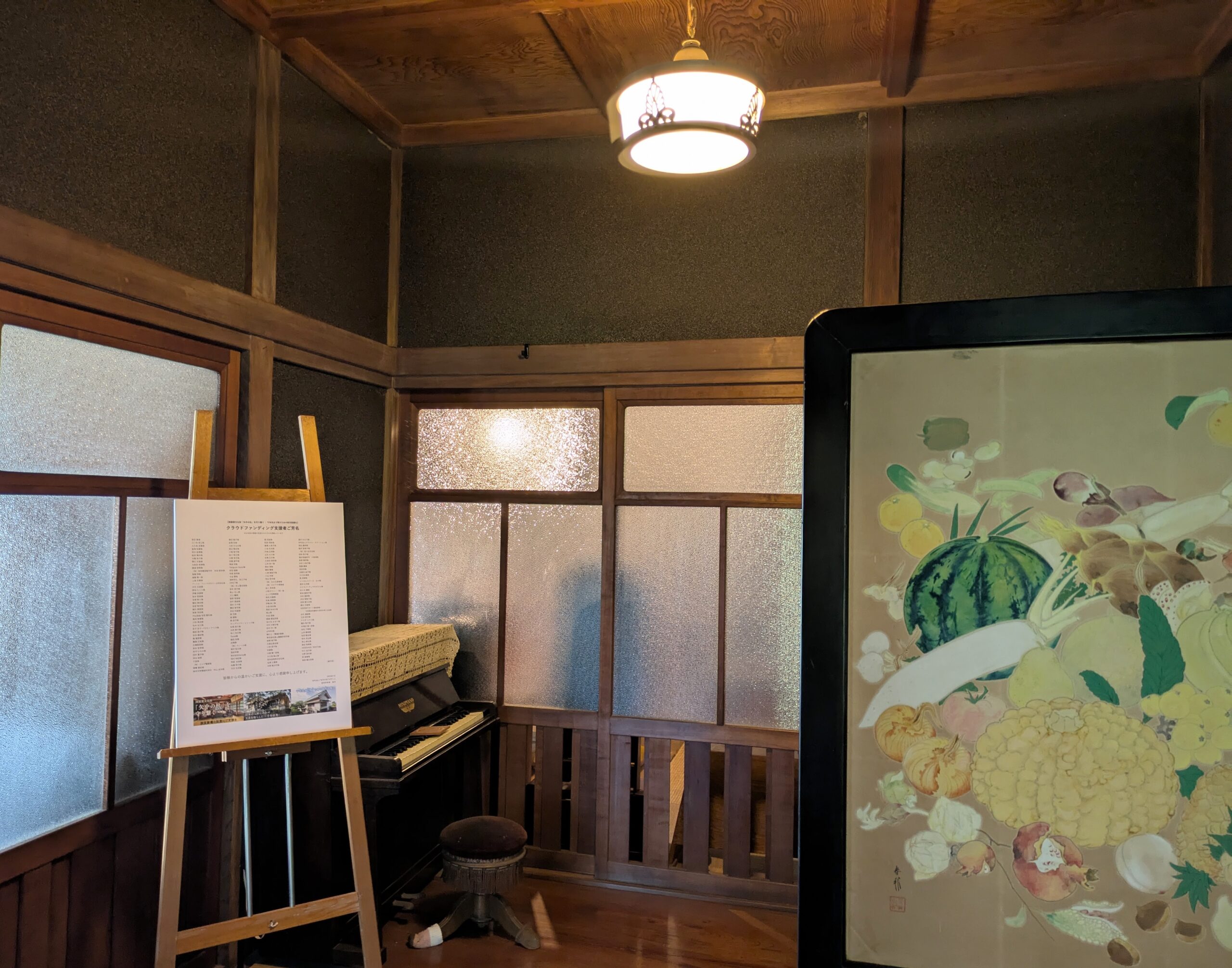 2025.07.21 守り人日記 〜7月20日〜 本格的な夏が到来。 強い日差しの中、 たくさんの方においでいただきありがとうございます。 外の日差しが強いからなのか、 漆仕上げの床に外の景色が映りこんで、涼しげに見えました。 6月に終了したクラウドファンディング、支援いただいた皆様のお名前を掲示するパネルを設置しました。 希望いただいた方のみの掲載です。多くの方にご支援をいただいたと改めて思います。 ありがとうございます。