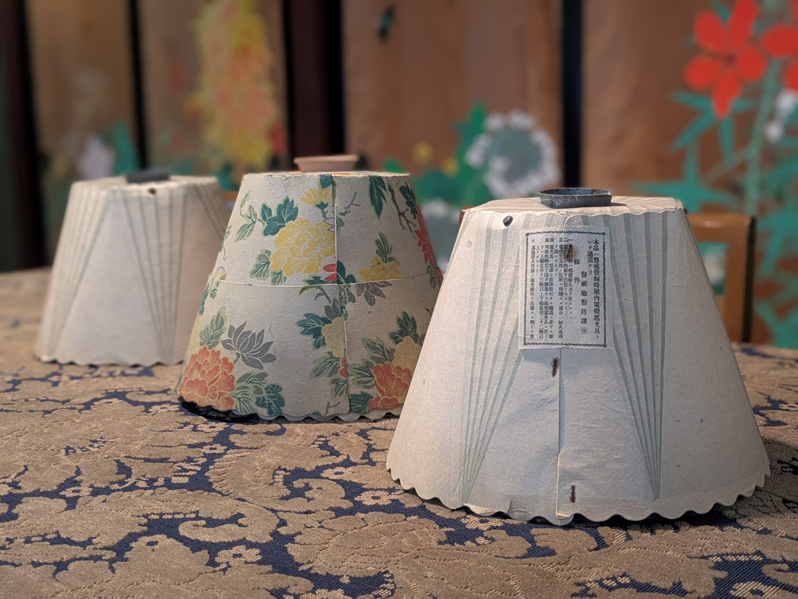 真ん中にある花柄のものは下半分がずれて上にずらせるようになっており、灯火管制の時間以外は、裾を上げて、遮光を緩めたのかな、とも思えます。