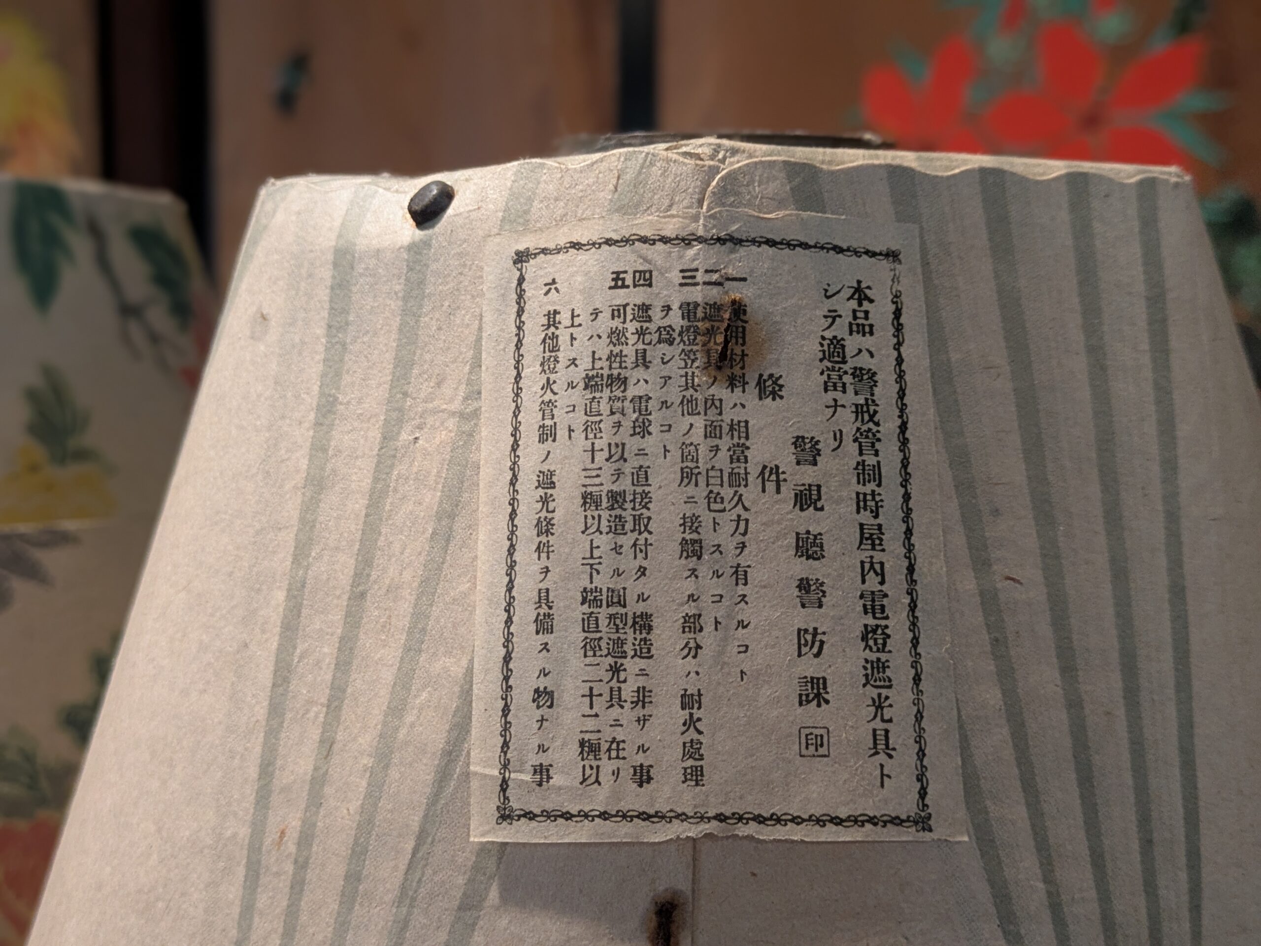 火事を出さないように耐火処理がされているようで、警視庁警防課による認可を受けた旨の印が塗布されています。