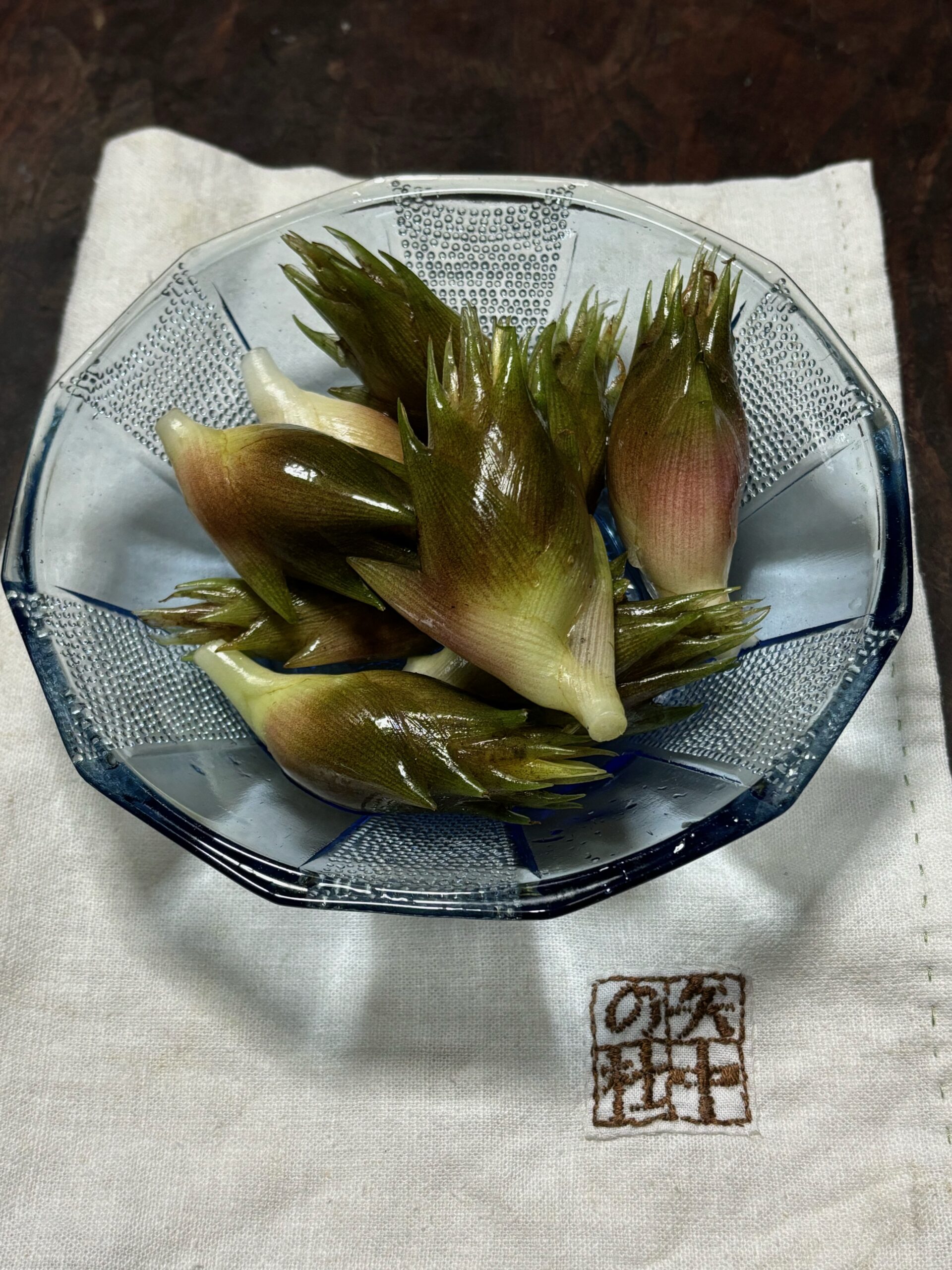お客様のご案内も一区切りつき、ふと目を前庭にやると風に薙ぎ倒されたらしき茗荷の葉が目に入りました