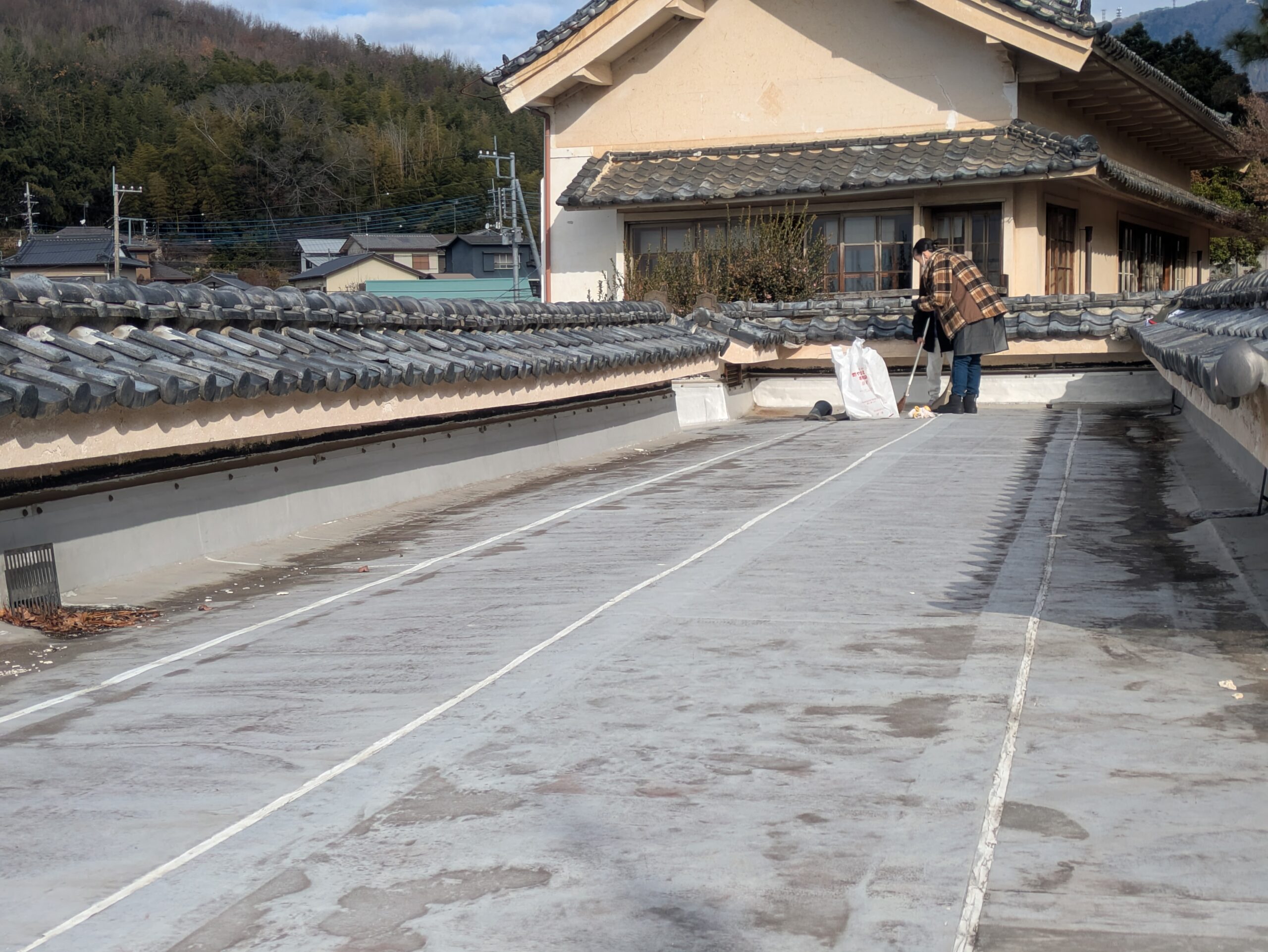一年のすすはらいとして、各部屋の天井や欄間や長押など、普段手が届かないような場所のホコリを払い、台の上や床など埃を拭き取りました。本館の陸屋根も、排水口など落ち葉などが溜まりやすいところを掃除しつつ、雨漏りの危険はないかをチェック。庭を掃き清め、邸内の神棚と仏壇も掃除しました。