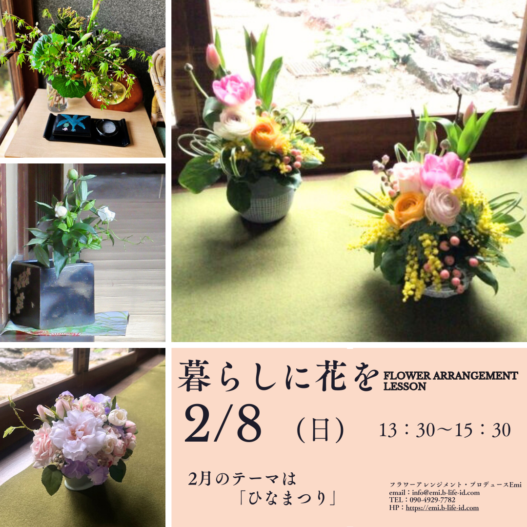 『暮らしに花を フラワーアレンジメントレッスン』はフラワーアレンジメント・プロディースEmiの定期レッスンです。季節の暮らしに寄り添うアレンジメントレッスンで、初心者でも大丈夫。お好きな時だけの参加も大歓迎です。お花でリフレッシュしましょう。