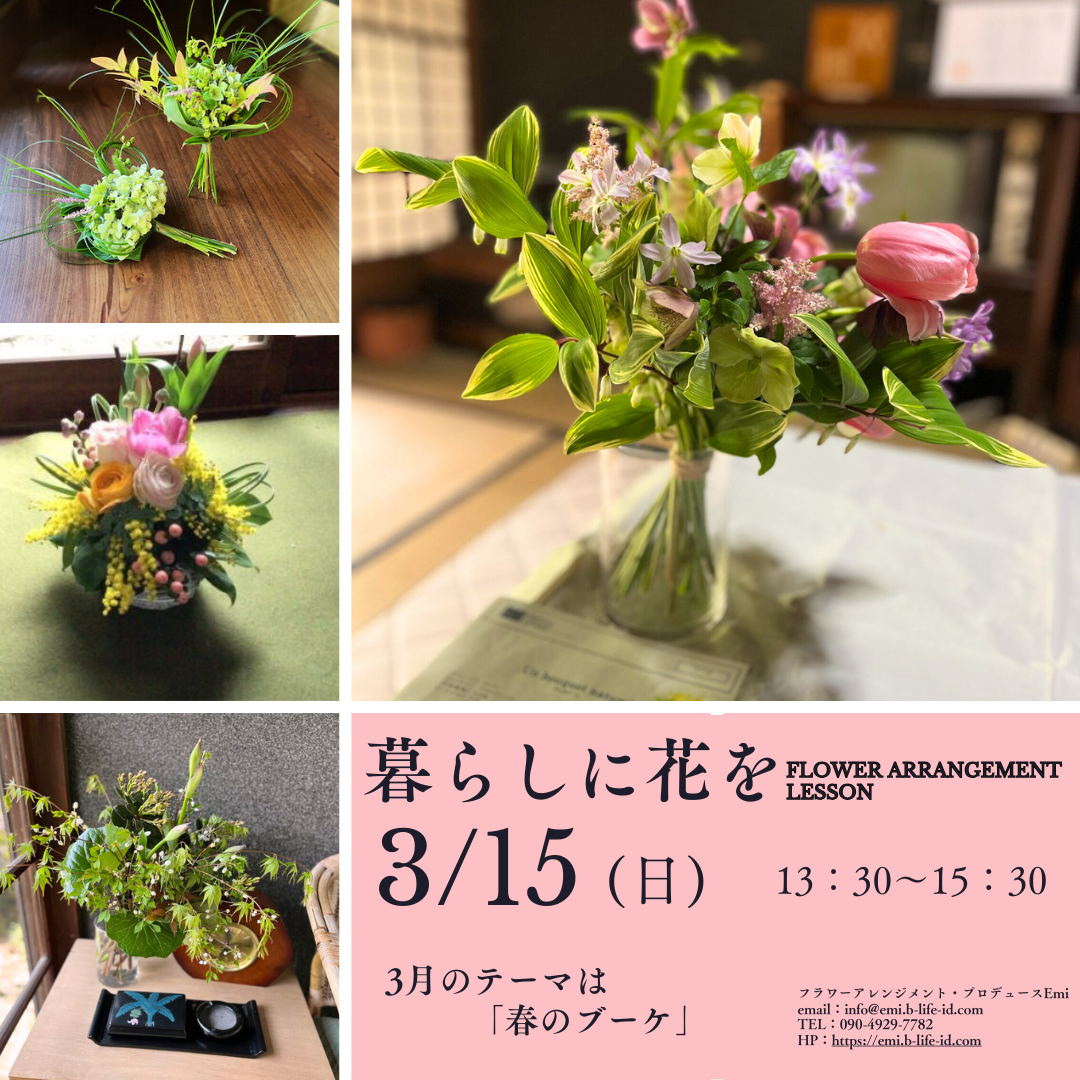『暮らしに花を フラワーアレンジメントレッスン』はフラワーアレンジメント・プロディースEmiの定期レッスンです。季節の暮らしに寄り添うアレンジメントレッスンで、初心者でも大丈夫。お好きな時だけの参加も大歓迎です。お花でリフレッシュしましょう。
