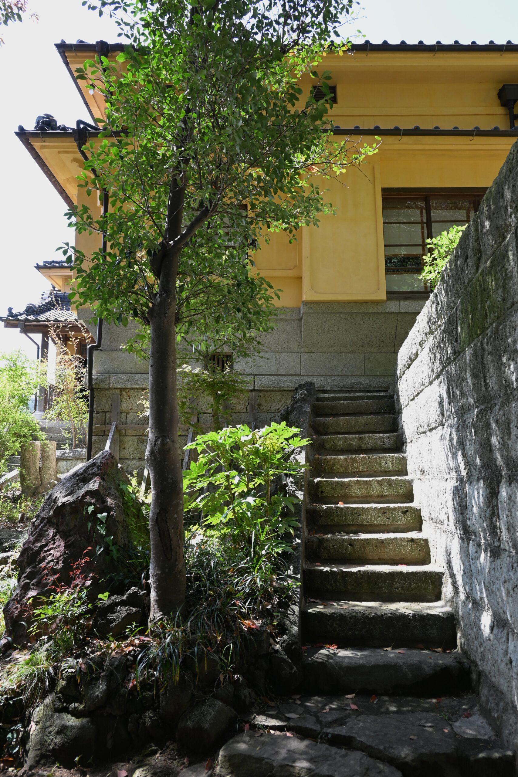 別館(迎賓棟)にお客様をお迎えする階段にしては少し幅が狭くも感じますが、上って右に曲がり数歩で中庭が見えて来るつくりとなっていて…