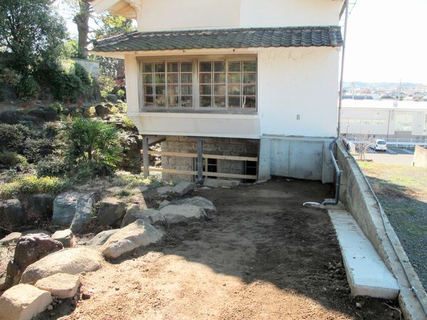 崩壊時に破損した大谷石ブロックもあったようで、全てが元通りでは無いが、かつての姿を取り戻す事が出来た。そして点検の結果問題が浮かび上がったのが、別館の北側に附属していた離れあとの基礎がコンクリートの擁壁を圧迫していると言う事。