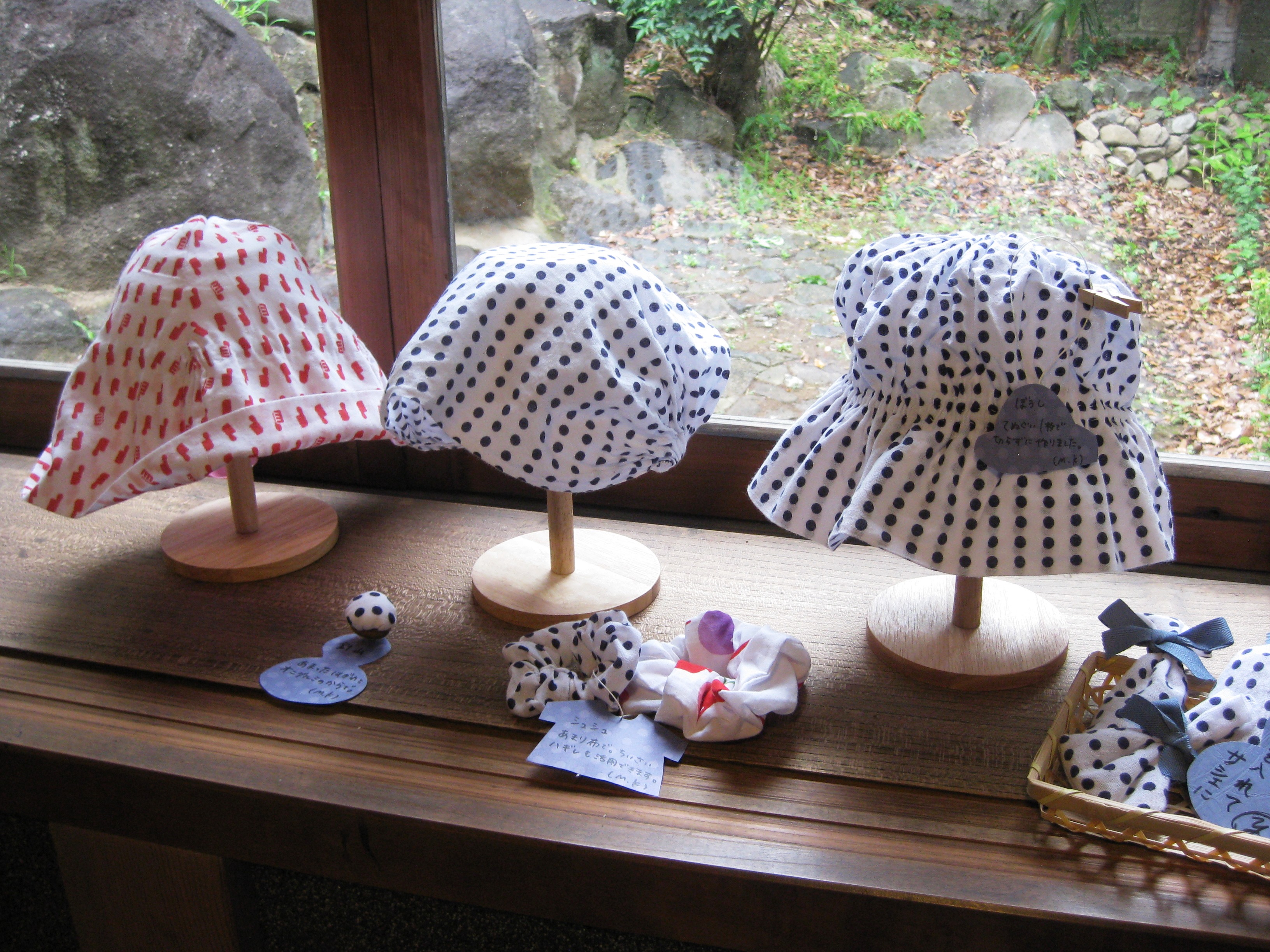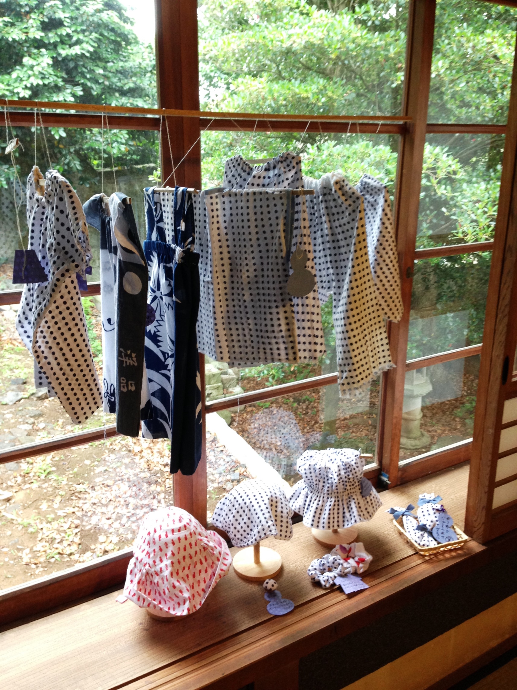 今年は手ぬぐいをそのまま展示するだけでなく、手ぬぐい(主に豆絞り)を活用してメンバー自身が手作りした服、子ども服、帽子、かばんなど、一手間加えた手ぬぐいグッズも展示しています。