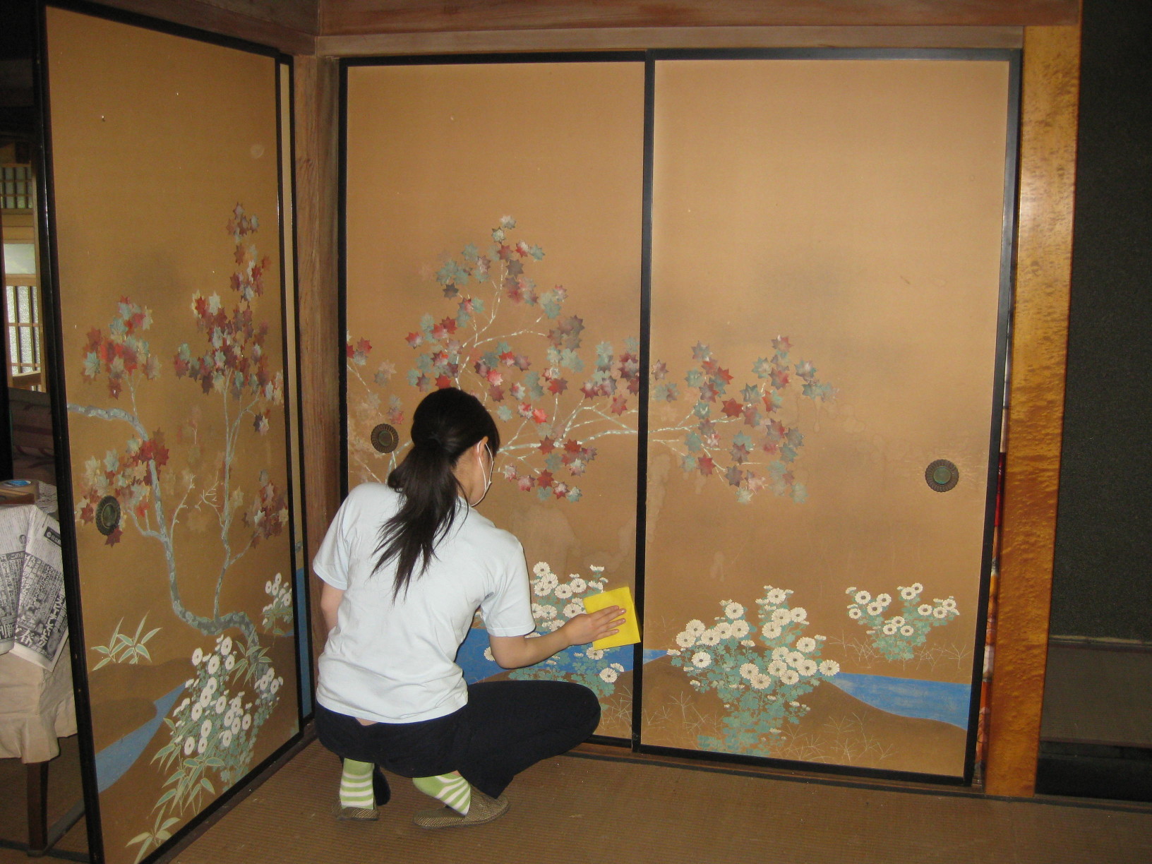 手をつけるべきところは山ほどありますが、まずは邸宅内から。初回は人数も多かったので、何ヶ所か分かれて作業しましたが、僕は別館2階の5畳間でした。そのときは、文化財の貴重さも知らず、西陣織のソファーをちょっと乱暴にはたいてしまったような…オーナーの森さん、ごめんなさい。