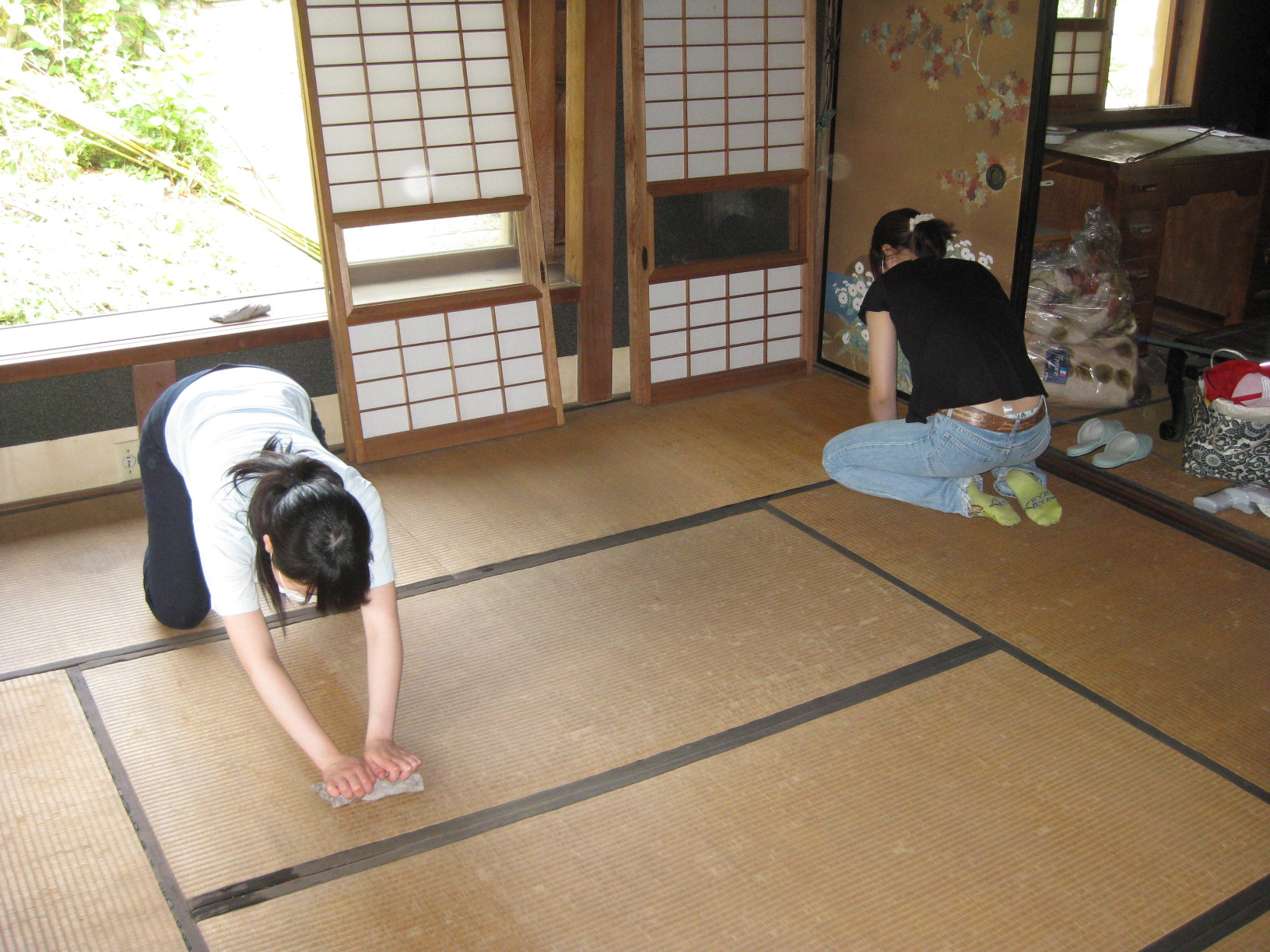 前回お話ししたように邸宅内は埃だらけなので、とても靴下では歩けません。室内用にスリッパを用意し、邸宅内はそれを履いていました。1日かけて掃除し、畳も拭き終わった部屋はスリッパ無しで上がれるようになります。「掃除完了」のサインですね。こうして、今週はこの部屋、翌週はこの部屋、と順番にスリッパを履くスペースが減っていき、ついに無くなって今に至ります。あ、今でも邸宅公開の際にはスリッパを履いていただいていますが、それとは別次元です(笑)。