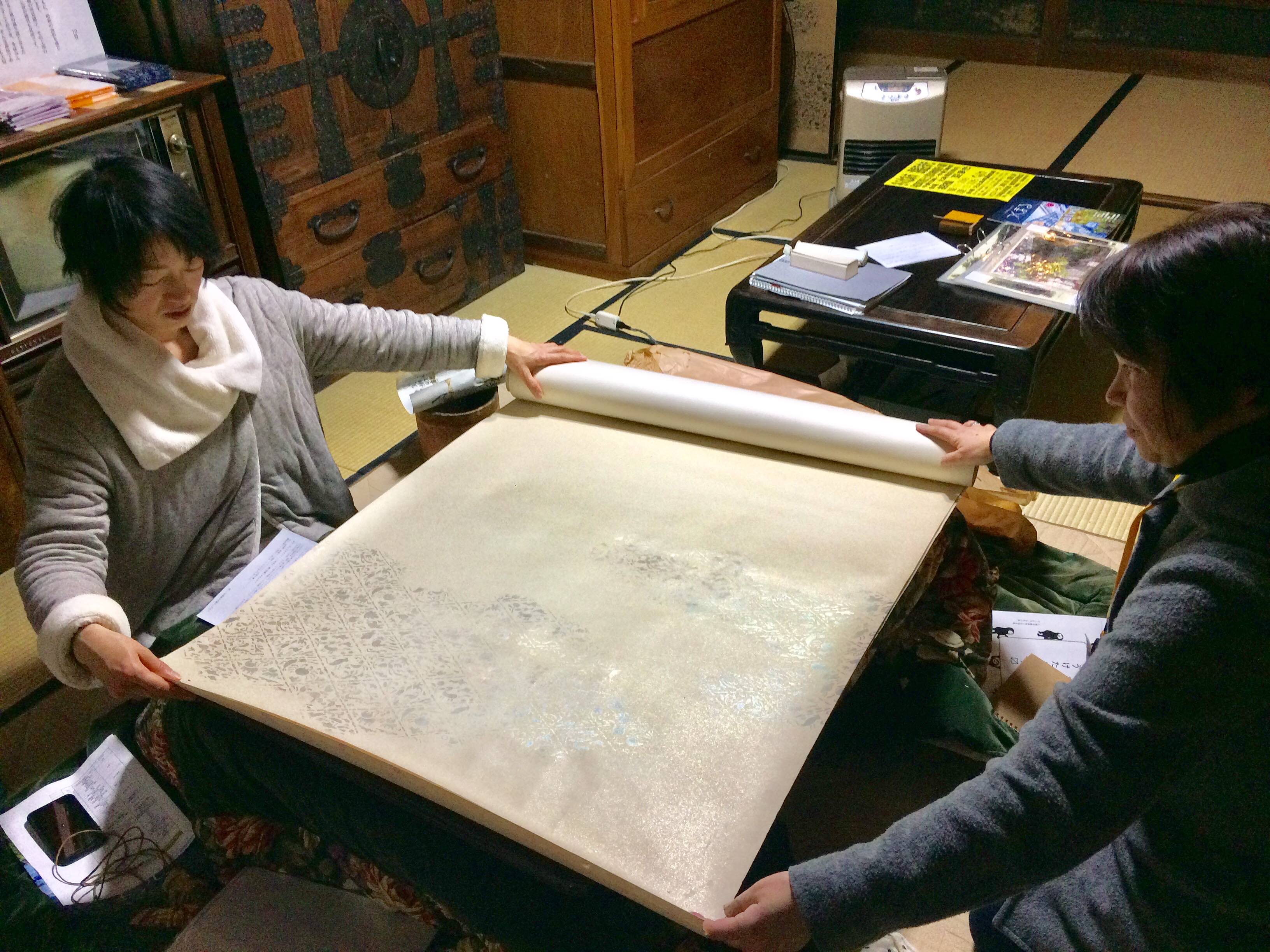 2018.02.05 守り人日記〜2月3日〜 こんにちは、守り人Iです。 今日は少々マニアックになりますが…守り人たちは驚き、喜ぶことうけあいのネタです。 知る人ぞ知る、そしてここ最近守り人の間でも人気なのが、本館居間の襖絵。 現物は経年劣化で日焼けして色も変わり、少々傷んでしまっているのですが、 なんと!! この襖絵の元の襖紙が残っていたのです!! そろそろと広げてみると… 白い紙の上に、銀箔で模様が描かれているではないですか!! 光の当たり具合で、多様な彩りを放っています。 これを見た守り人たちからは、今の襖絵とのあまりの違いに驚き、そして銀箔のあまりの美しさに感嘆のため息が漏れたのでした。