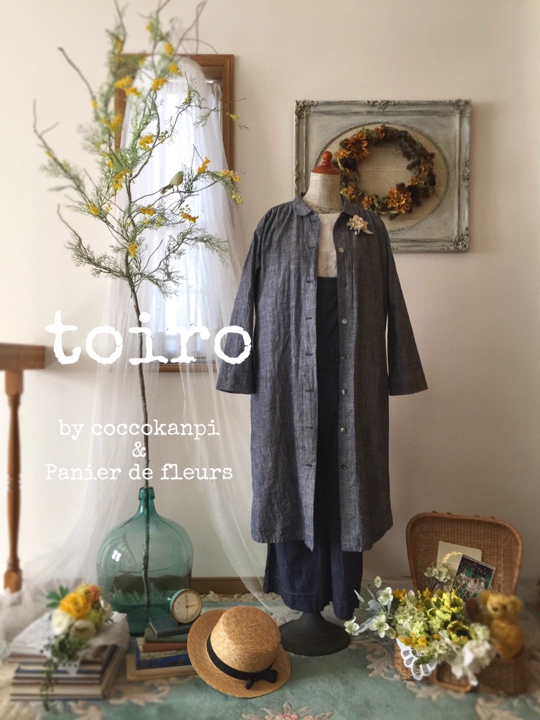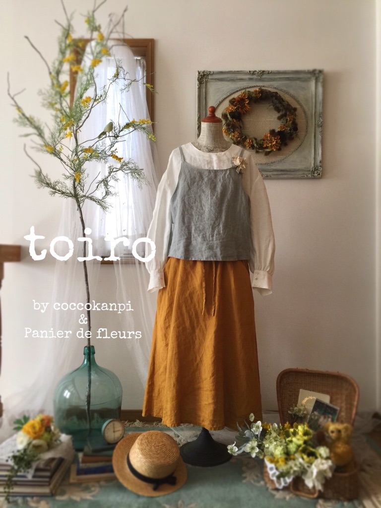 「coccokanpi」の暮らし の服、「Panier de fleurs」の季節の花とテーブルコーディネイトを演出するユニットtoiro。天然素材を中心にパターンから縫製まで手がけたオリジナルデザインの暮らしの服と、お出かけが楽しくなるようなアクセサリーやナチュラルスタイルの花雑貨を販売!ちいさな雑貨屋さんのような雰囲気が、地下室に広がります。