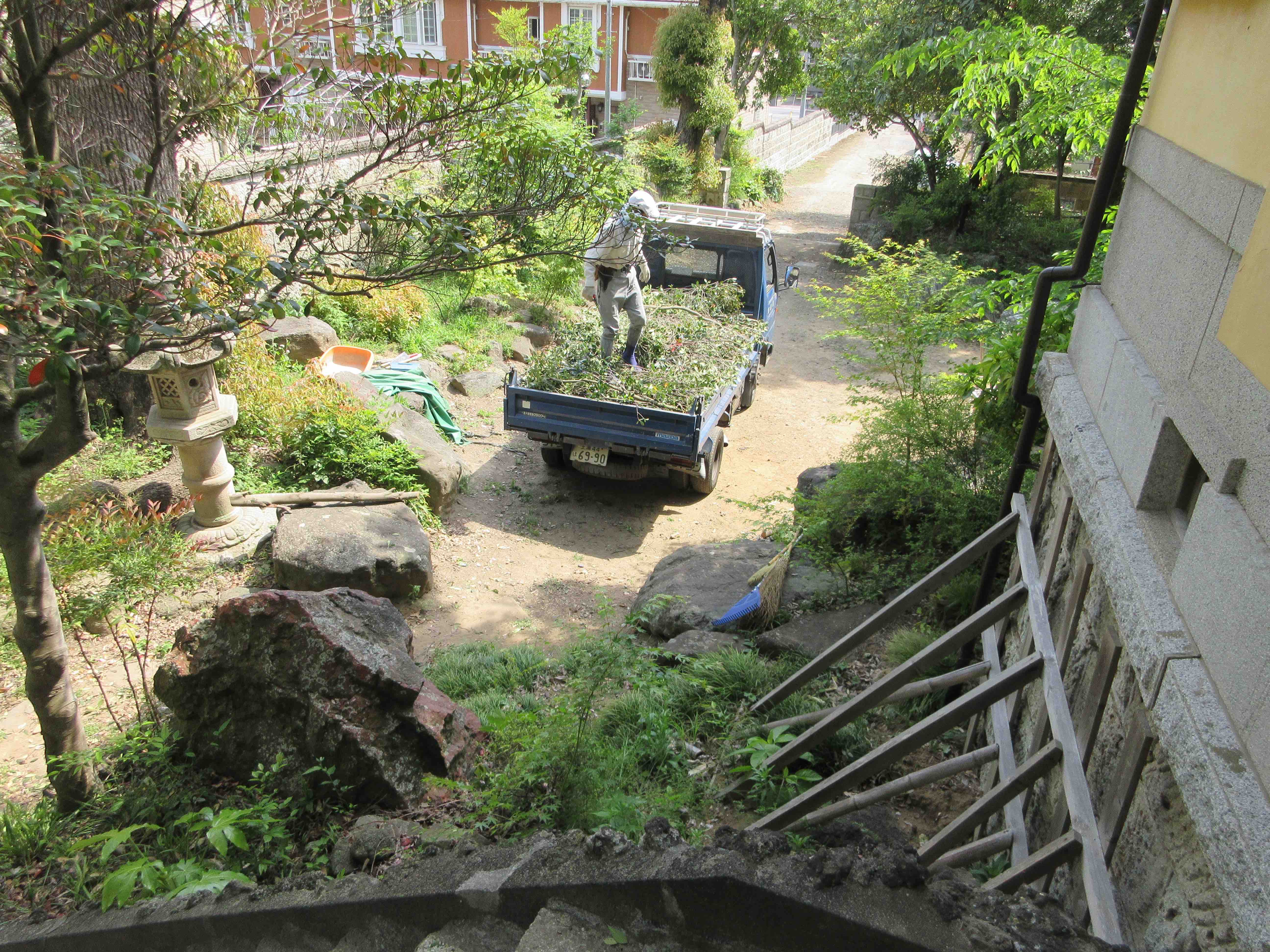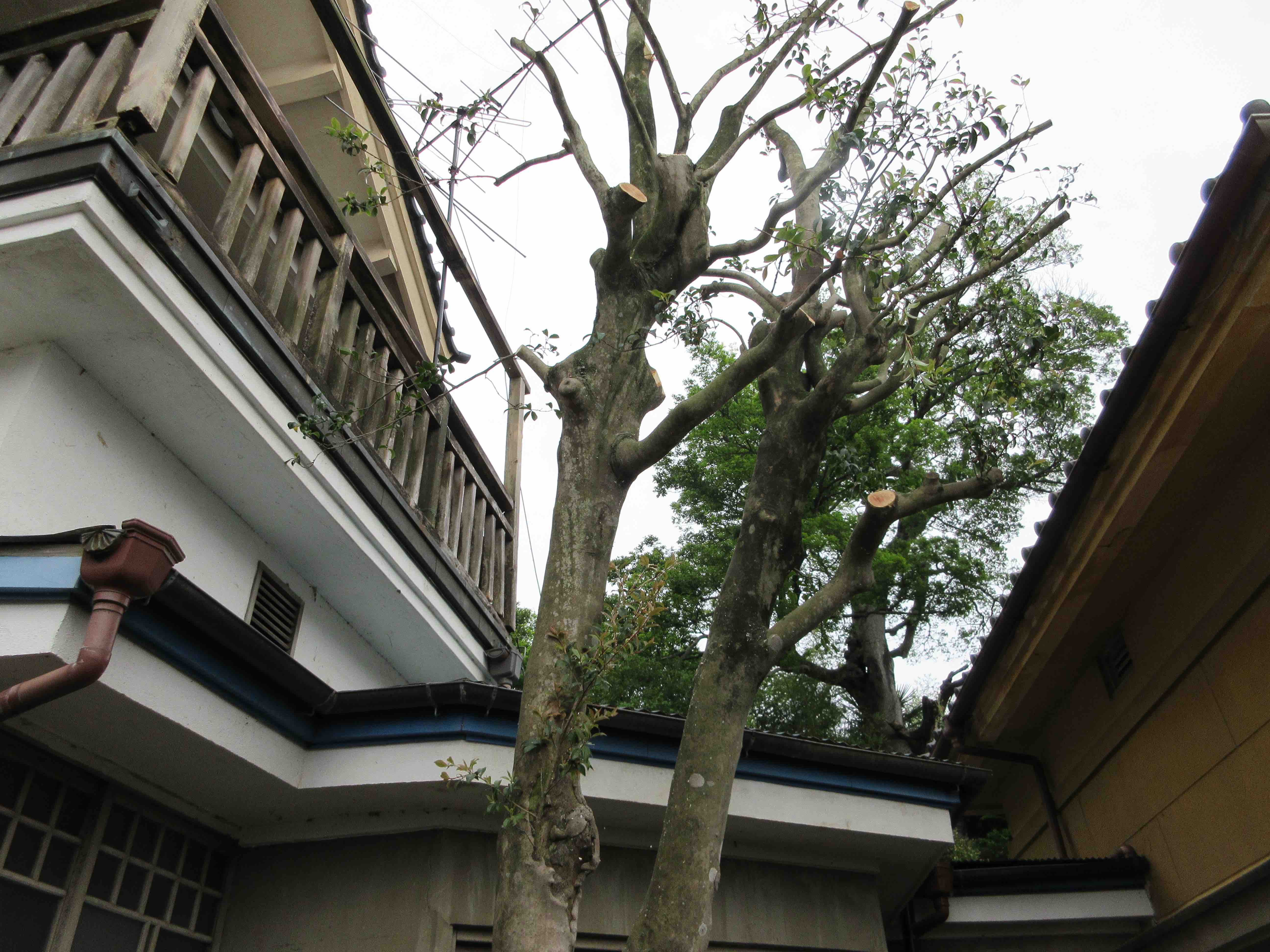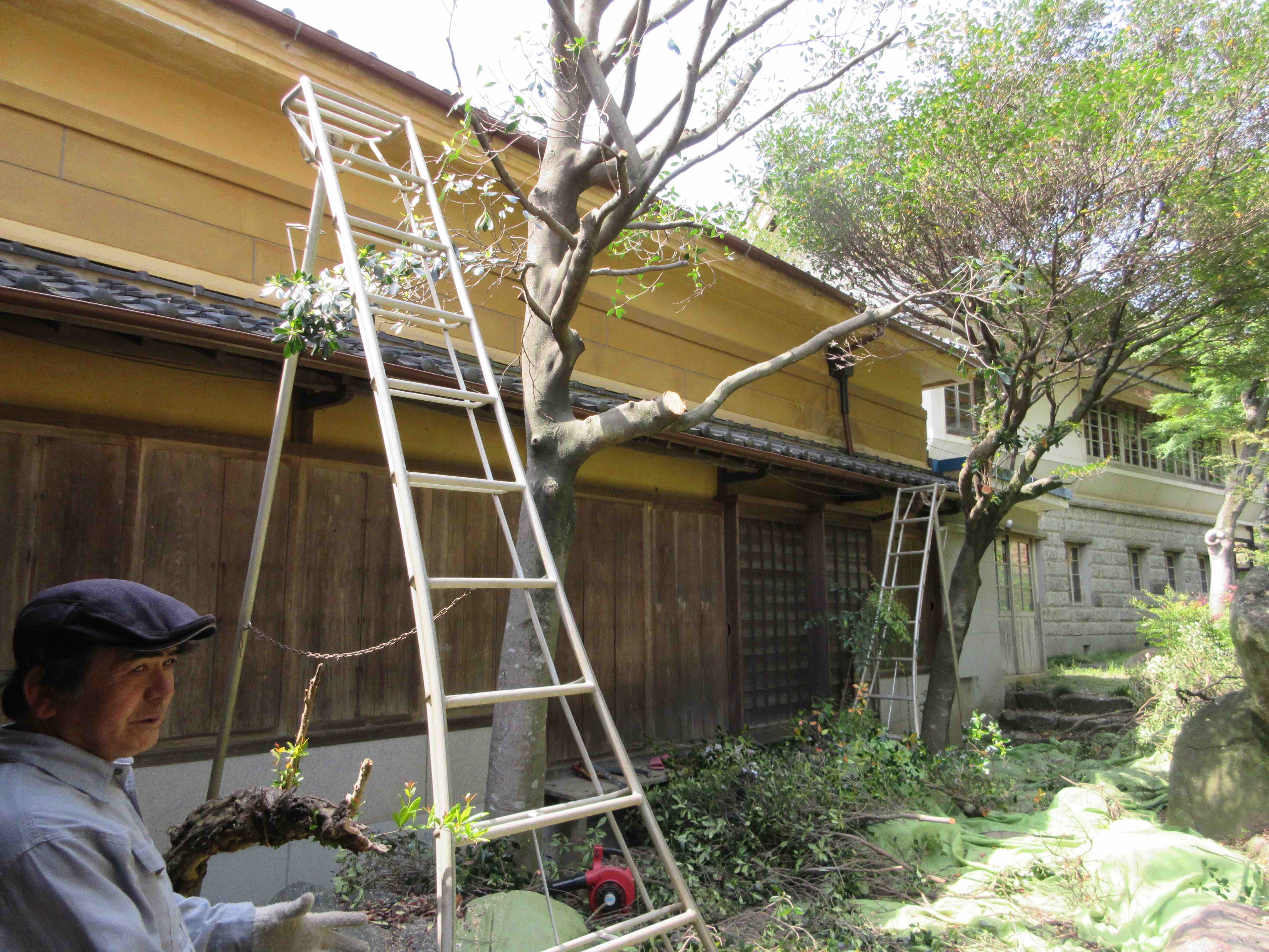 矢中の杜の庭園には、建設当時からある庭木と、実生で発生した樹木とが共存しています。どちらも今の矢中の杜には欠かせない庭園の一部です。のびのびと成長してくれているのはありがたいことですが、伸びた枝が邸宅の屋根に接し、葉が雨樋を塞ぐなど、このまま放置すると建物に影響が出るまでになっていました。と言って、ボランティアの手では担いきれない作業です。そこで、「御殿まるごとマーケット2018」で、皆様からいただいた入場料を使って、すっきりと安全に、これからが楽しみになるような剪定作業をお願いしました。