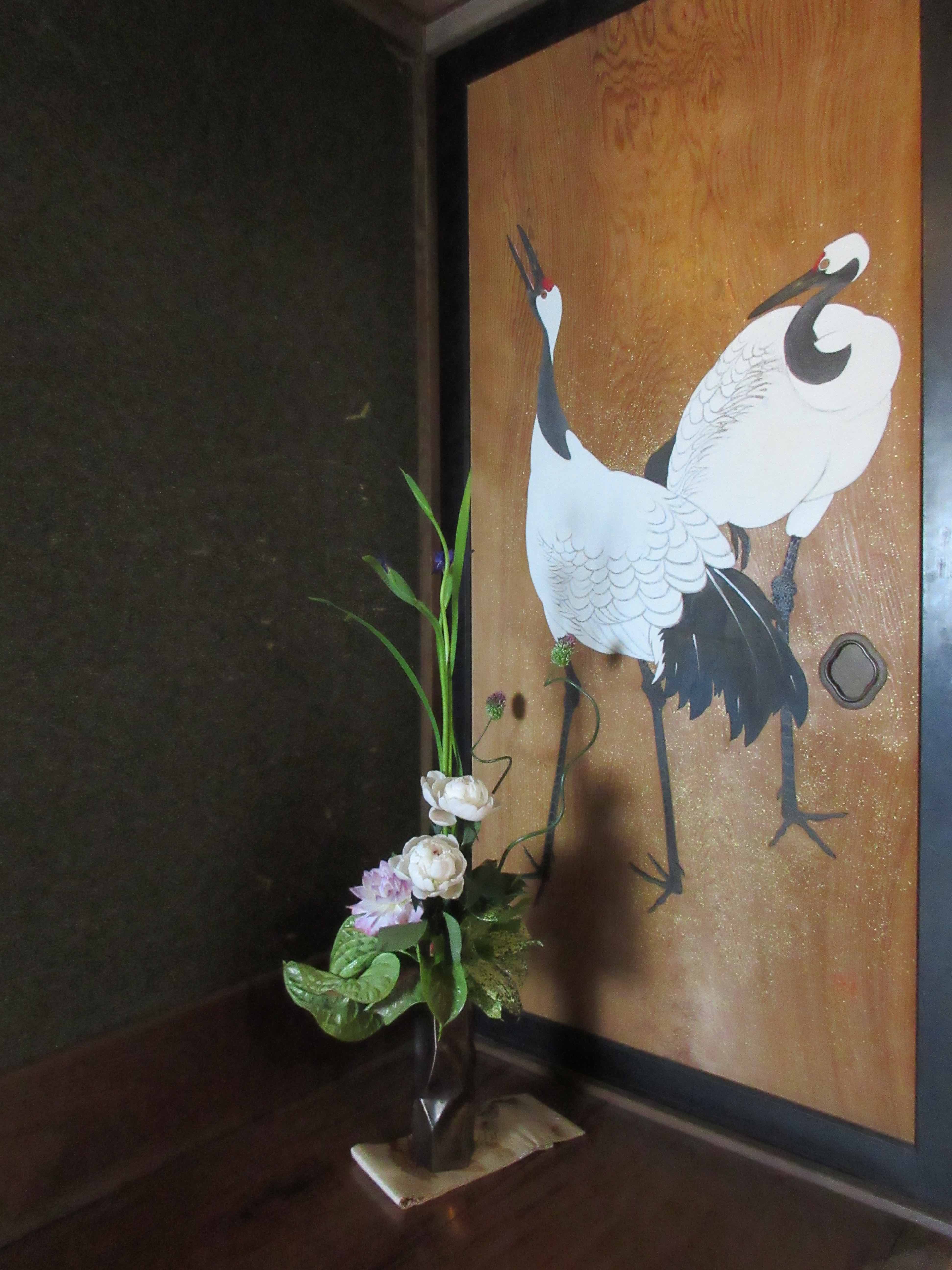 玄関ホールの杉戸絵の前には、絵の中のツルが出てきたような姿の作品が置かれ、凛とした印象が際立ちます。