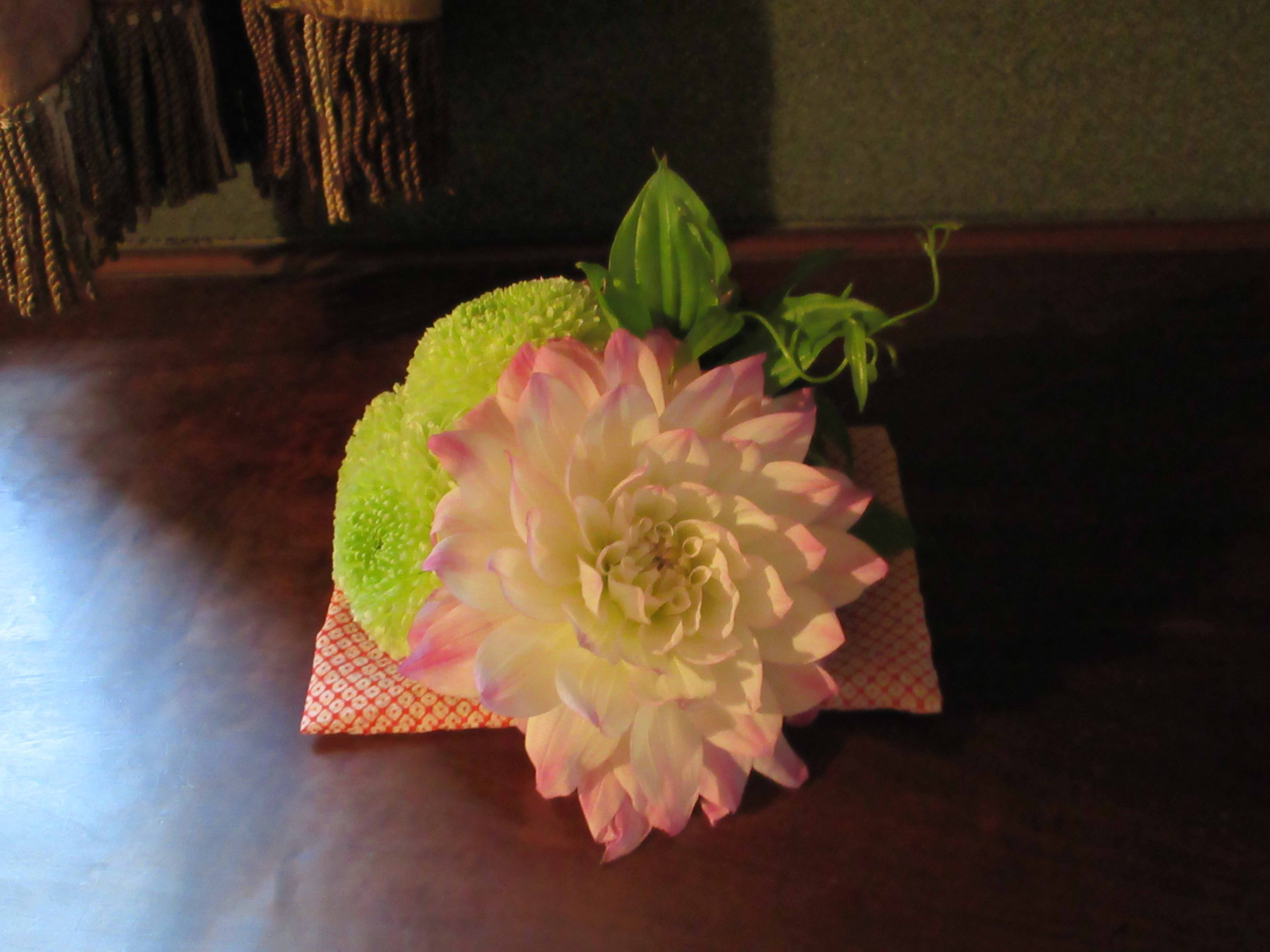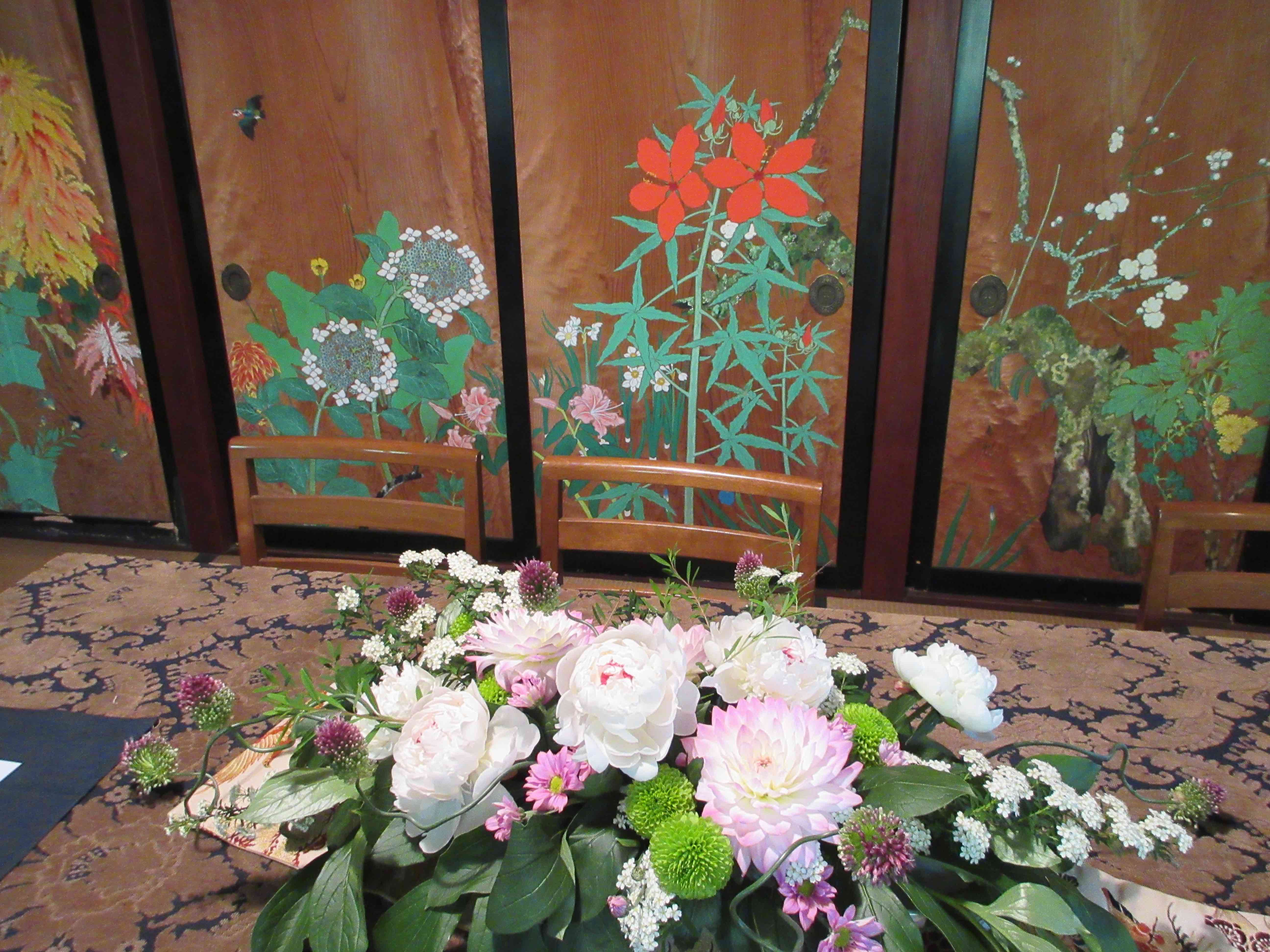 別館食堂の杉戸絵の艶やかさに、生花の華やかさが重なり、素敵な空間になりました。