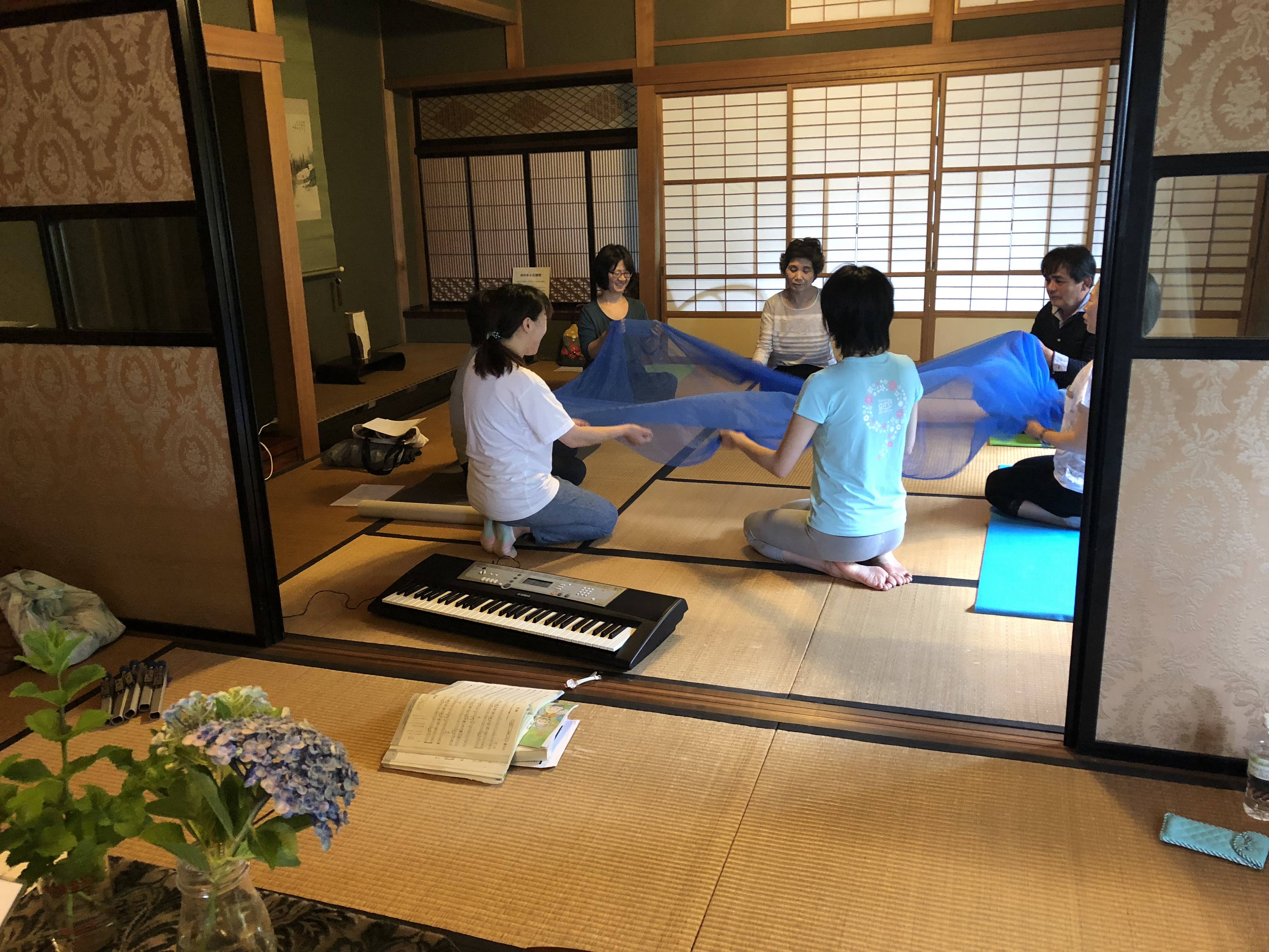海の歌を歌う際、海をイメージした布やさざ波を模した楽器を使い、五感で楽しみました!