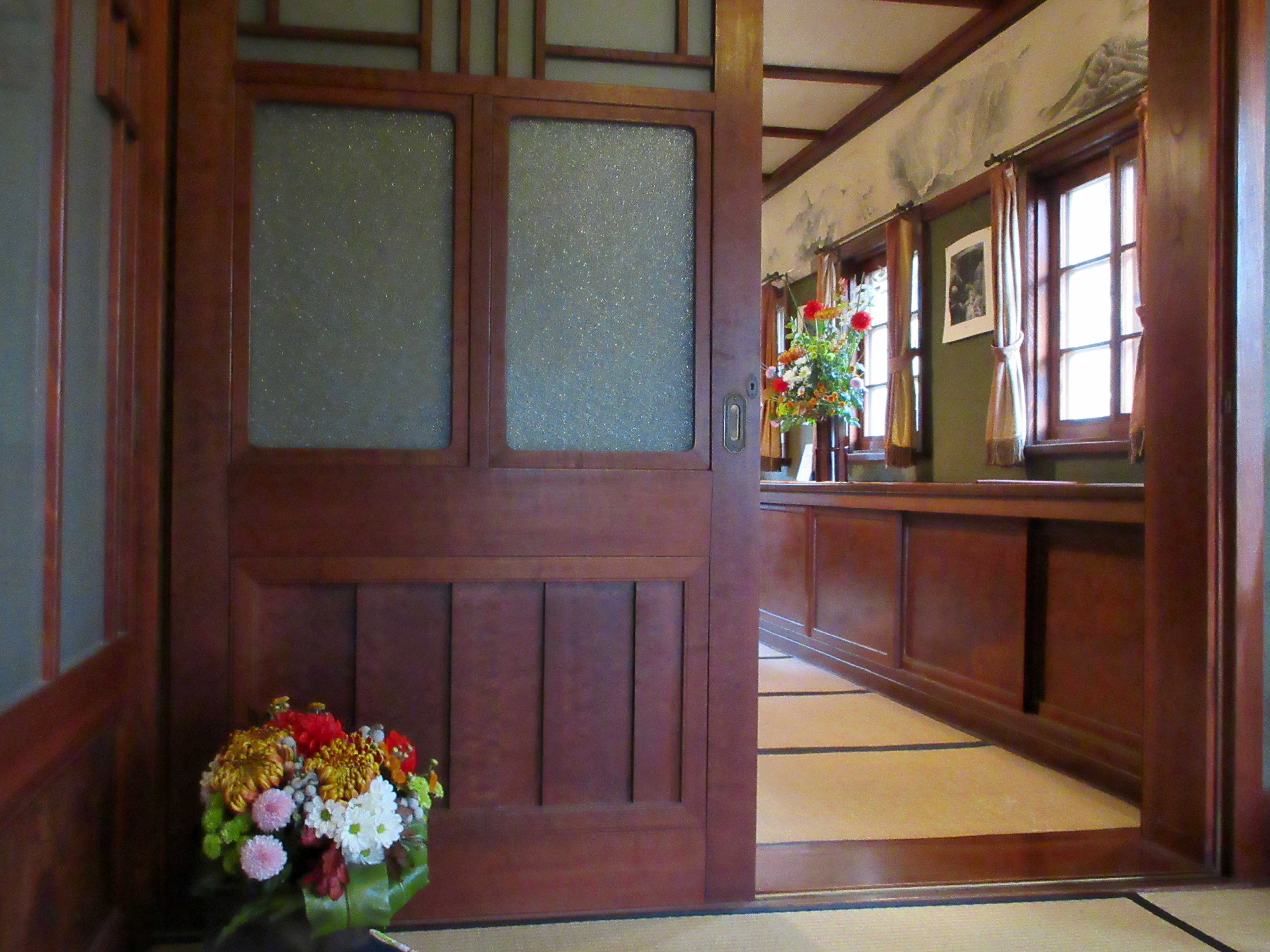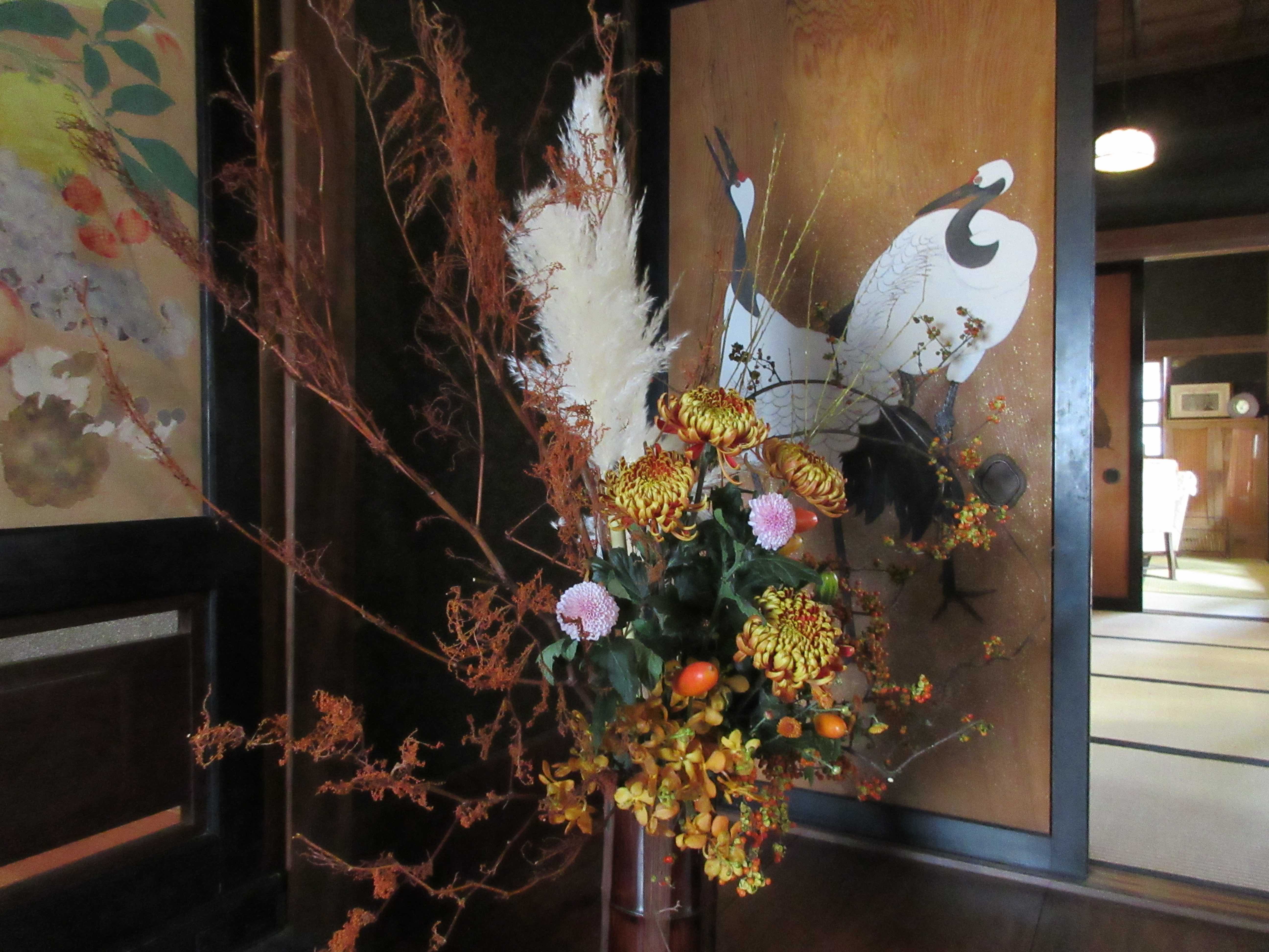 メインに使われた大輪の菊は邸宅にある杉戸絵をモチーフに選んだのだそう。くっきりと浮かび上がる杉戸絵とそれに負けず華やかで凛とした菊との組み合わせは大変印象的でした。