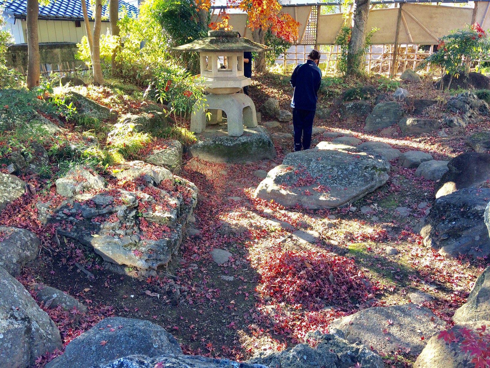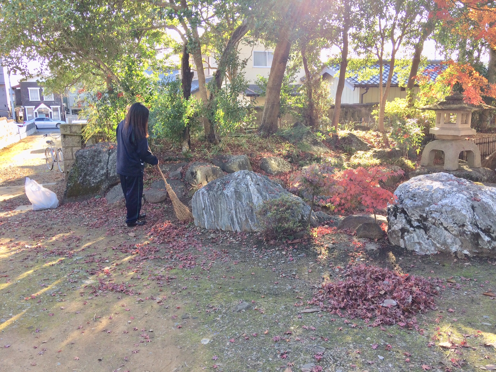 最後に前庭を真っ赤に染めるモミジの落ち葉の掃き掃除をして、